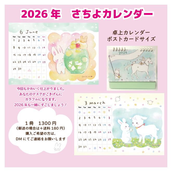 本商品は、特別にカレンダー用に書き下ろしたイラストを含む、さちよの魅力あふれるイラストが13枚つづりで構成されています。かわいうさぎや動物たちが、毎月のページを彩ります。